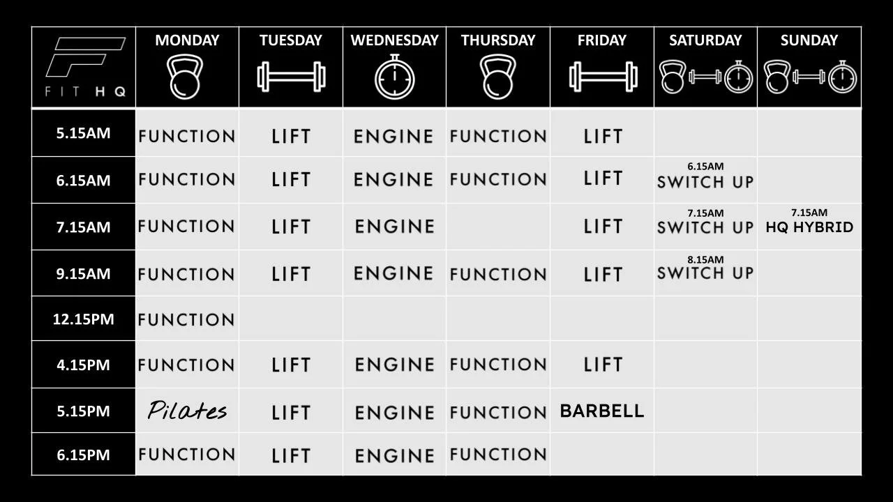 SWITCH UP - Our Saturday crowd favourite. You never quite know what’s coming - but you can count on a fun, high-energy session with the whole Fit HQ crew. The best way to start the weekend.